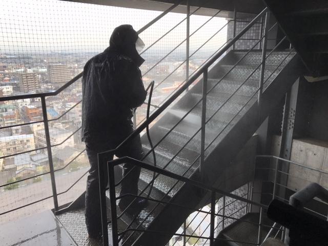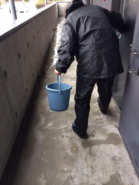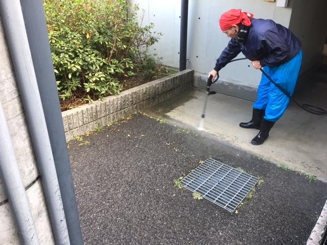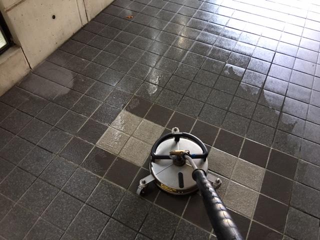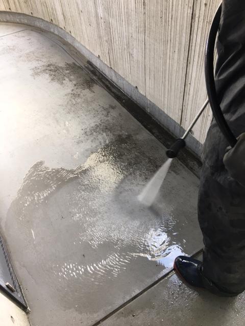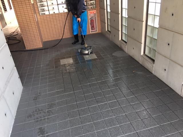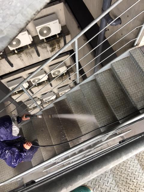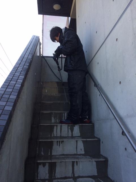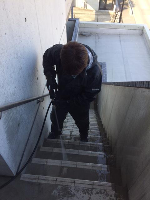 定期的に、マンション・アパートの通路 階段を業務用洗浄機で洗い流す作業になります。